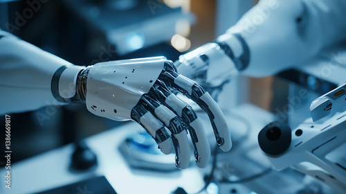 Wall mural a cybernetic engineer working on a human augmentation project, clean tech lab with robotic limbs and - Wall murals Wall mural a cybernetic engineer working on a human augmentation project, clean tech lab with robotic limbs and - Wall murals