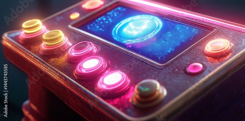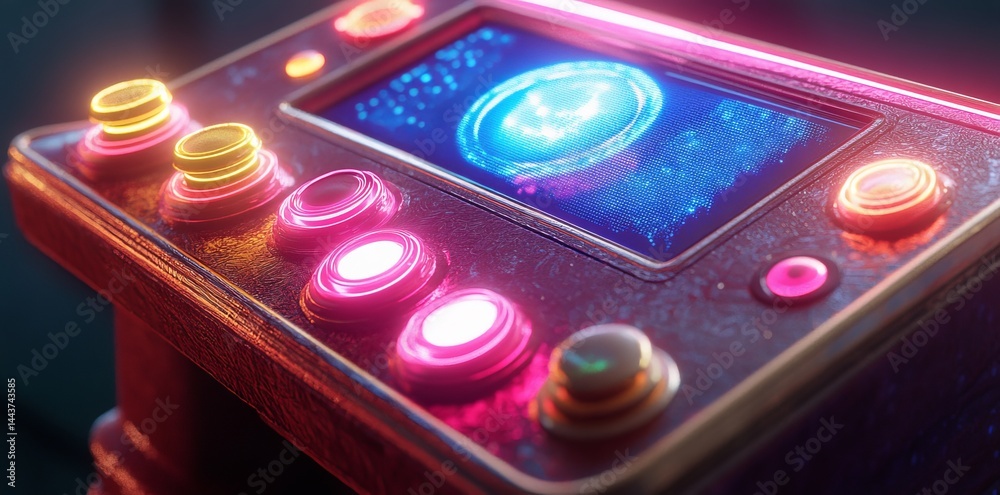 The watermark will not be included on Wall mural.: A dark and intimate view of the control panel reveals a glowing blue screen with a grid pattern on d
