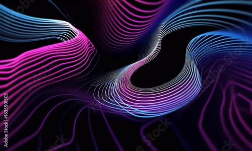Wall mural a dark background with neon lines creating an abstract pattern of undulating waves, with glowing edg