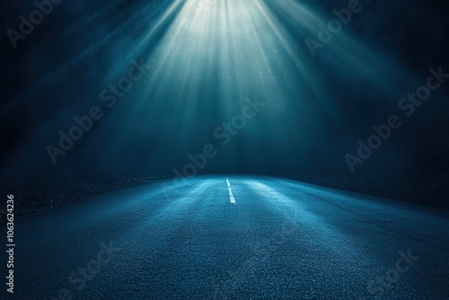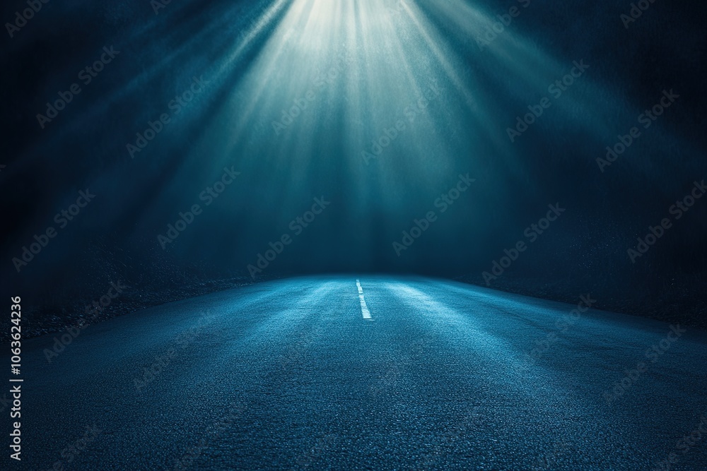The watermark will not be included on Wall mural.: A dark blue background with rays of light shining down on an empty asphalt road, creating a dramatic