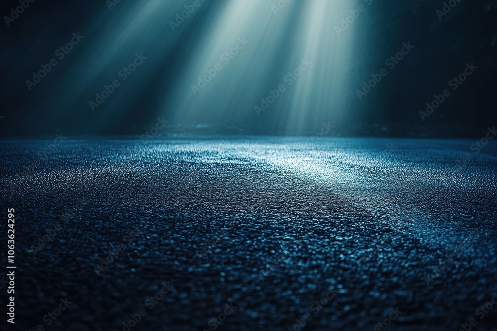 Wall mural a dark blue background with rays of light shining down on an empty asphalt road, creating a dramatic - Wall murals Wall mural a dark blue background with rays of light shining down on an empty asphalt road, creating a dramatic - Wall murals