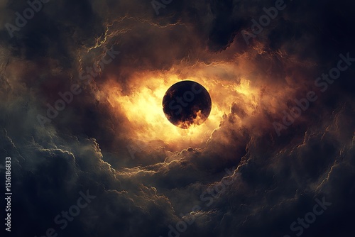 Wall mural a dark celestial sphere glows amidst swirling golden clouds in a cosmic spectacle - Wall murals Wall mural a dark celestial sphere glows amidst swirling golden clouds in a cosmic spectacle - Wall murals