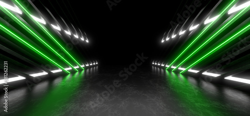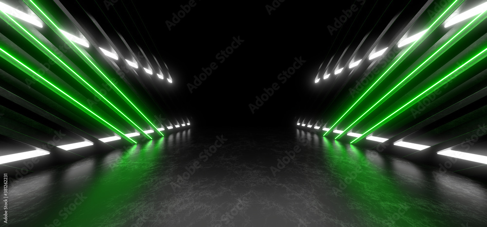 The watermark will not be included on Wall mural.: A dark corridor lit by colorful neon lights - reflections on the floor and walls - 3d rendering image -