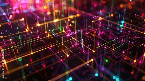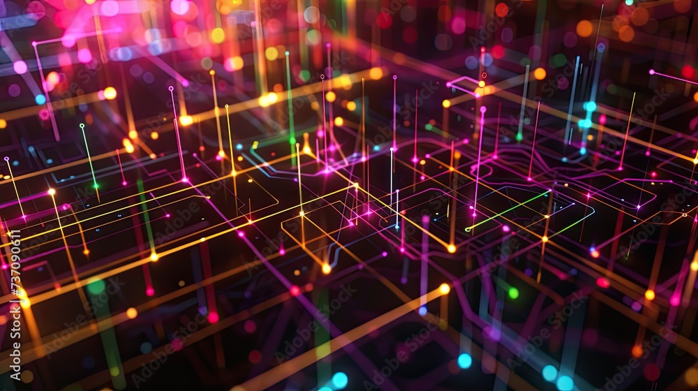 Wall mural a dark illustration of a technical system with colorful lines connecting different flow states - Wall murals Wall mural a dark illustration of a technical system with colorful lines connecting different flow states - Wall murals