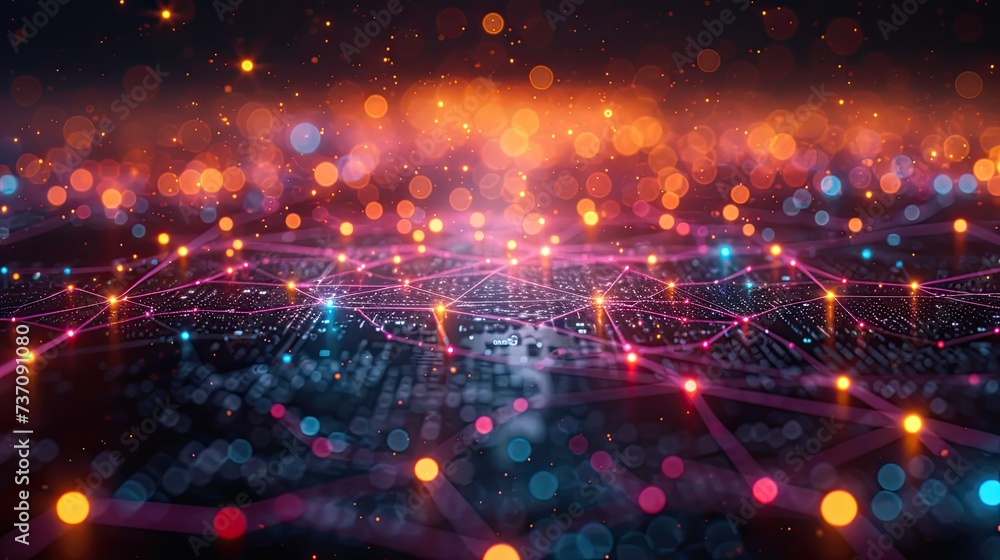 The watermark will not be included on Wall mural.: A dark illustration of a technical system with colorful lines connecting different flow states
