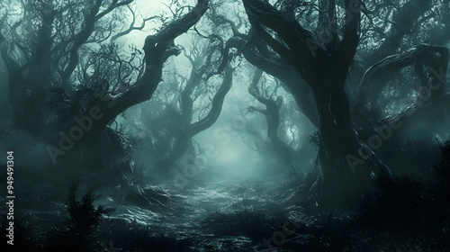 The watermark will not be included on Wall mural.: A dark mysterious forest with twisted forms and dense fog