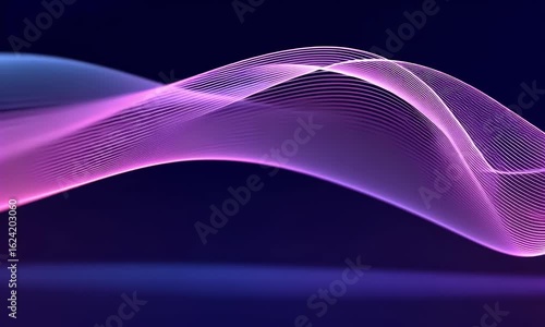 The watermark will not be included on Wall mural.: A dark purple background with pink and blue lines of light, creating an abstract wave pattern -