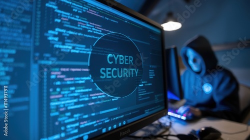 Wall mural : A dark room with computer screens displaying code, emphasizing cyber security -