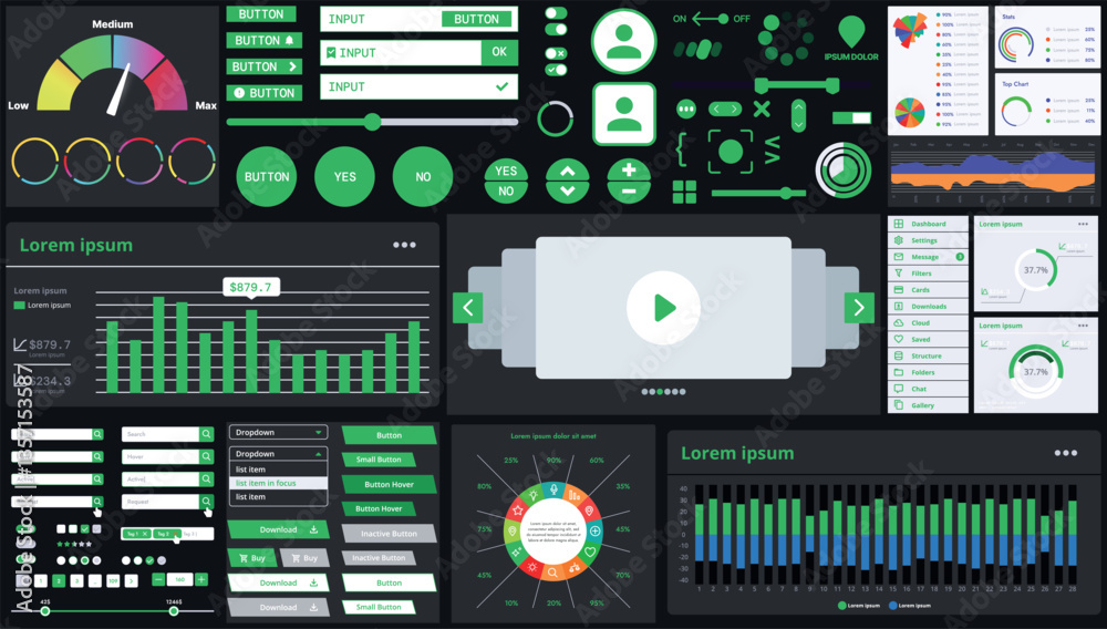 Wall mural a dark set of interface elements for web and mobile applications with modern icons, buttons, and gra - Wall murals Wall mural a dark set of interface elements for web and mobile applications with modern icons, buttons, and gra - Wall murals