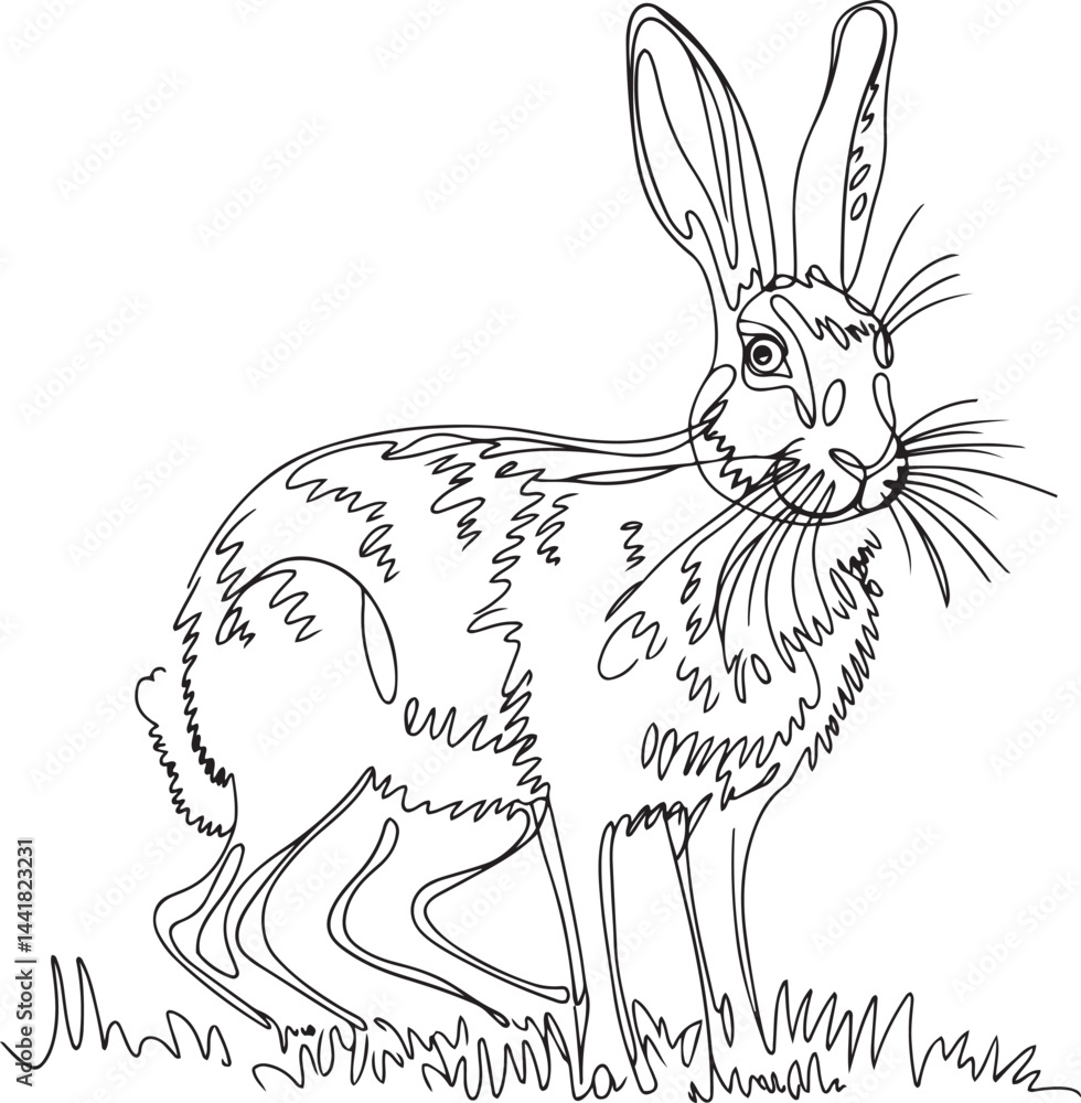 The watermark will not be included on Wall mural.: A delicate continuous line vector art drawing showing a hare standing on a grassy field portrayed wi
