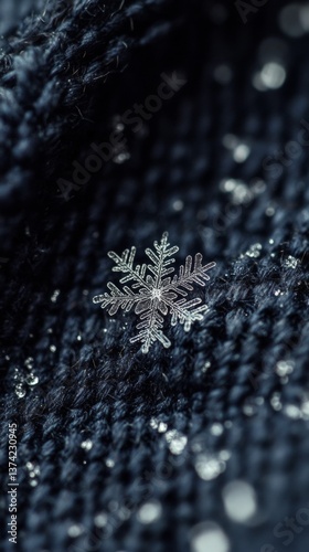 Wall mural a delicate snowflake rests on dark fabric. the intricate details of the snowflake contrast with the
