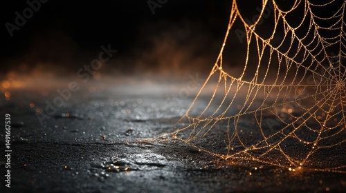 The watermark will not be included on Wall mural.: A delicate spider web, shimmering with golden light on the wet asphalt at night - the background is b