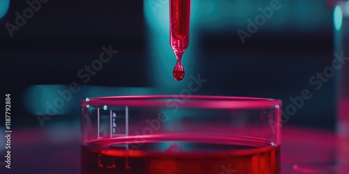 Wall mural : A detailed shot captures a drop of red liquid falling from a pipette into a beaker, set against a sc
