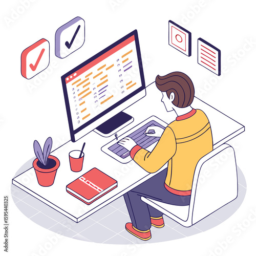 The watermark will not be included on Wall mural.: A developer is coding on a computer at his desk, working on a software application or website, with