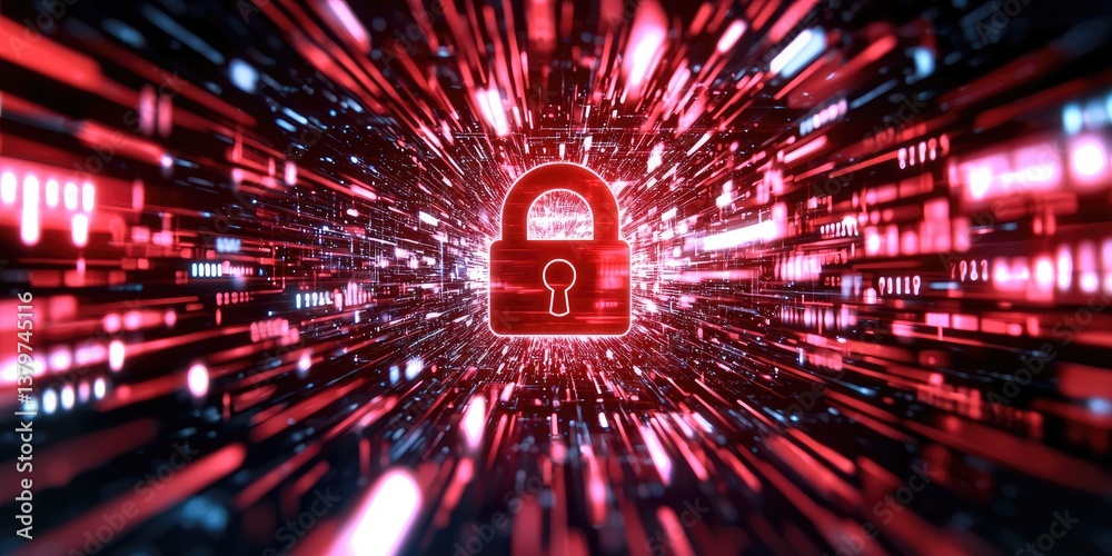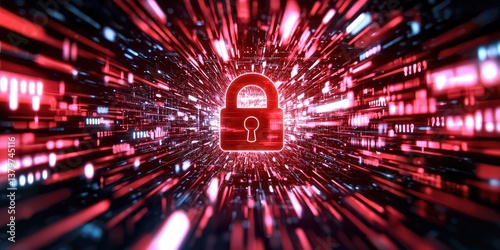 Wall mural : A digital backdrop pulsates with a menacing red alert warning padlock symbol, surrounded by binary l