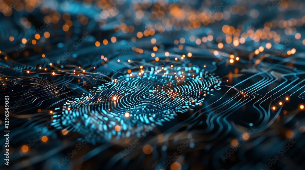 The watermark will not be included on Wall mural.: A digital fingerprint on a circuit board with glowing lines and lights -