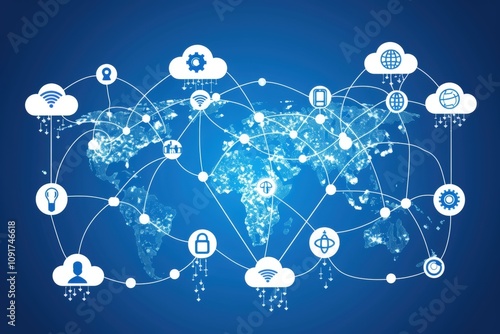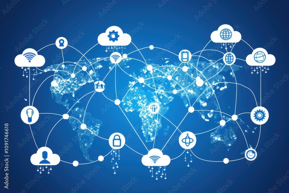 Wall mural a digital illustration showing a global network with cloud computing symbols, interconnected by line
