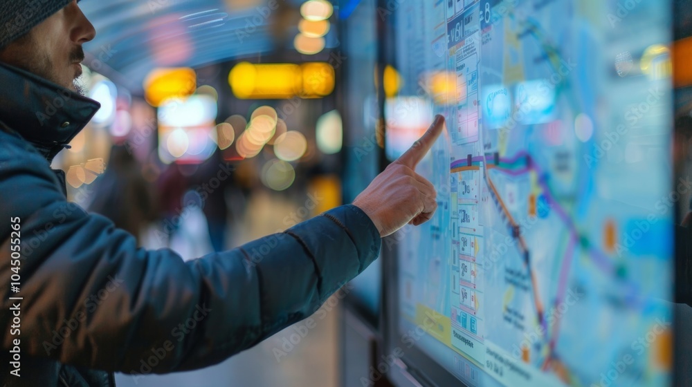 Wall mural : A digital kiosk displaying bus routes and schedules with a man using it to plan his trip -