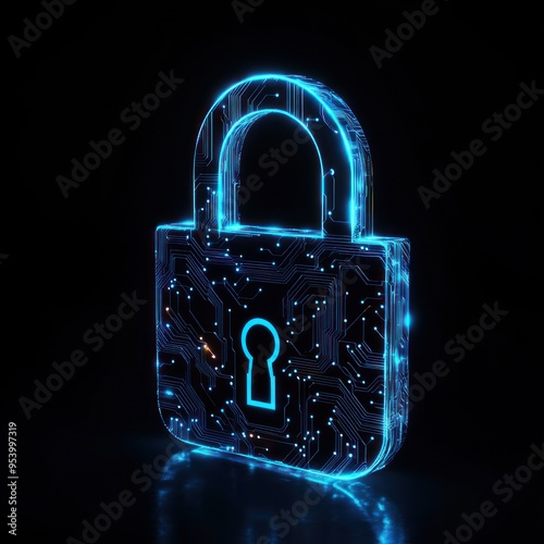 Wall mural : A digital lock icon with circuit patterns glowing in blue, symbolizing advanced security technology