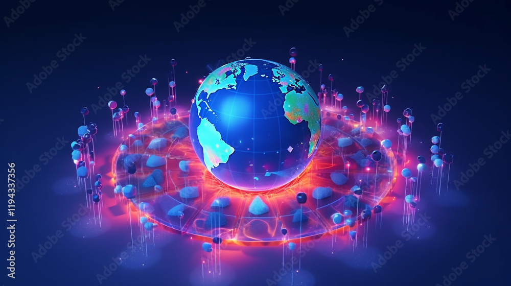 The watermark will not be included on Wall mural.: A digital map of the world with glowing lines connecting various points, representing global connect
