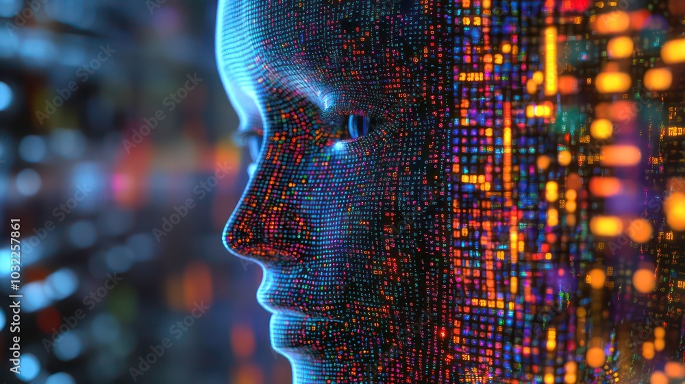 Wall mural : A digital portrait of a female face composed of pixels and code, set against a bokeh background of c