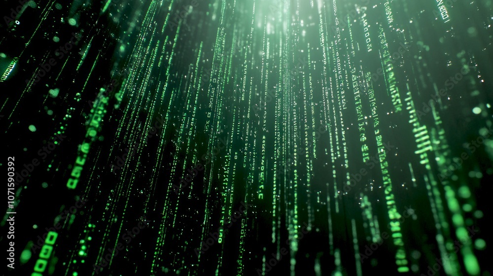 Wall mural : A digital rain of green code streams down a dark background - this abstract image symbolizes technolo
