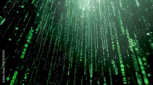 Wall mural a digital rain of green code streams down a dark background. this abstract image symbolizes technolo