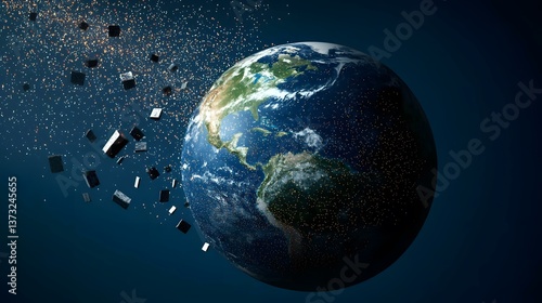 The watermark will not be included on Wall mural.: A digital rendering depicts earth with numerous small, dark cubic objects and glittering particles d