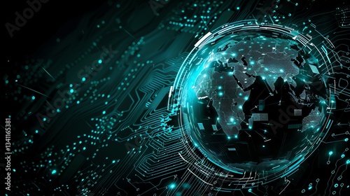 The watermark will not be included on Wall mural.: A digital rendering of the earth with glowing blue lines and dots on a circuit board pattern -