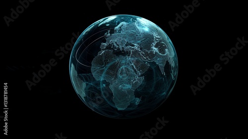 The watermark will not be included on Wall mural.: A digital rendering of the earth with glowing lines and data points, set against a black background -