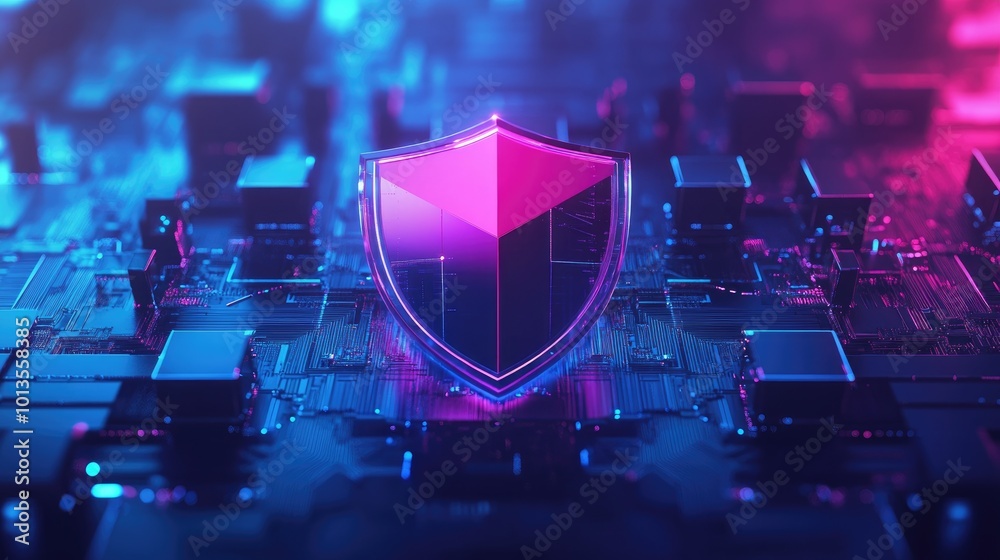 Wall mural : A digital shield protecting a network of servers and computers, symbolizing cybersecurity and secure