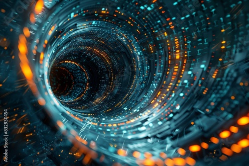 Wall mural : A digital vortex with swirling glitches, fragments of code and data spiraling towards its corrupted