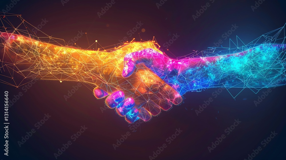 The watermark will not be included on Wall mural.: A digitally rendered image of two hands shaking, made up of glowing lines and nodes -