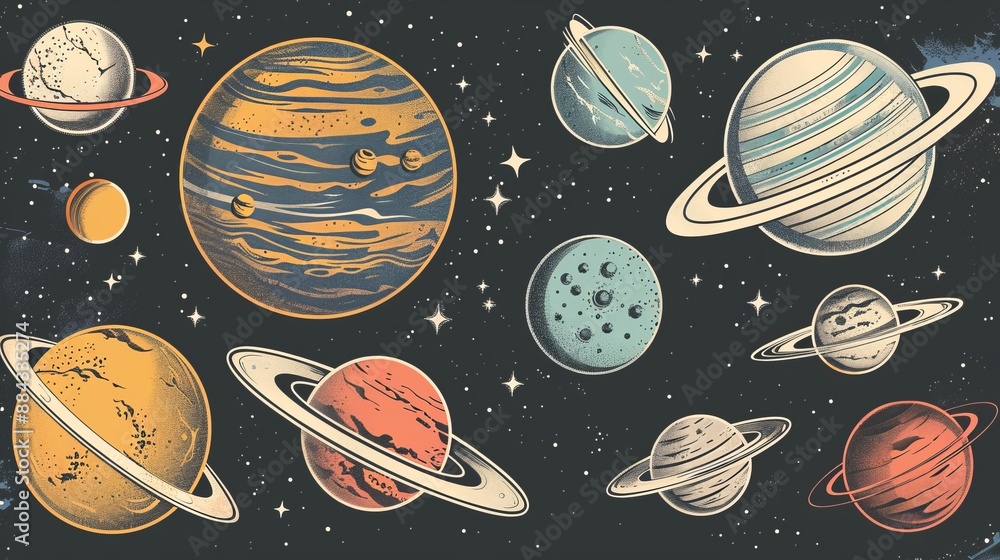 Wall mural a diverse collection of planets rendered in artistic styles. each planet showcases unique characteri - Wall murals Wall mural a diverse collection of planets rendered in artistic styles. each planet showcases unique characteri - Wall murals