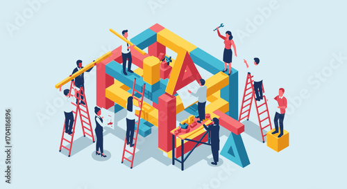 The watermark will not be included on Wall mural.: A diverse team of business professionals working together, using ladders and tools to build a large,