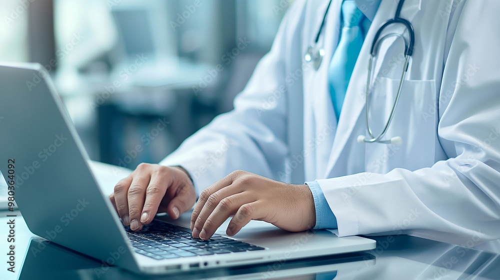 The watermark will not be included on Wall mural.: A doctor working on a modern laptop computer making a report about patient condition or doing some r