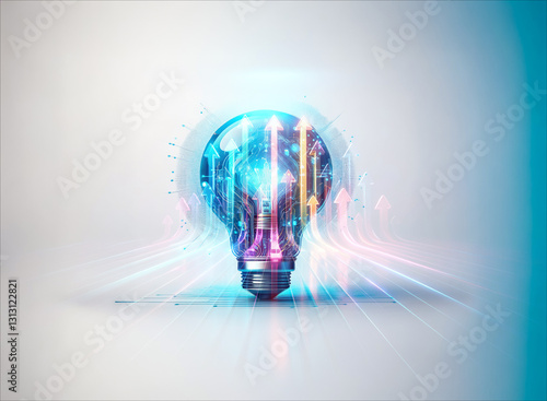 Wall mural a double exposure image of a light bulb filled with upward arrows, creating a sense of growth and in