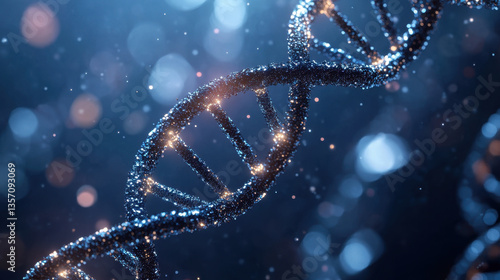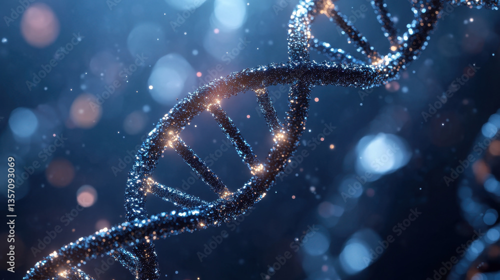Wall mural : A double helix dna structure reveals intricate patterns and sparkles against a soft, blurred backgro