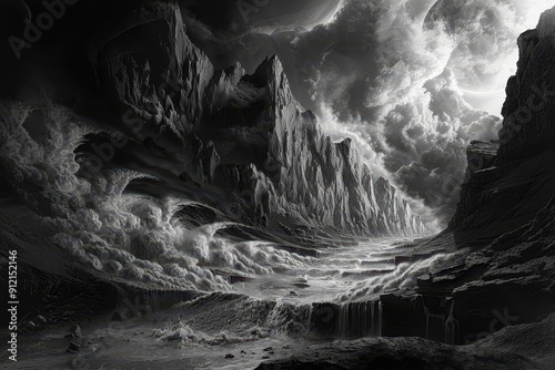 The watermark will not be included on Wall mural.: A dramatic black and white landscape with a moon and waves crashing against rocky cliffs