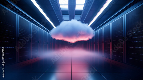 The watermark will not be included on Wall mural.: A dramatic image of a cloud materializing in the center of a server room, casting a soft light over