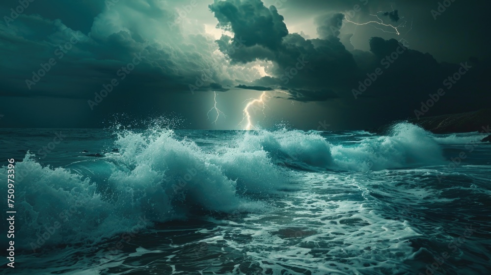 Wall mural a dramatic image of a stormy ocean with lightning in the sky. suitable for weather-related projects