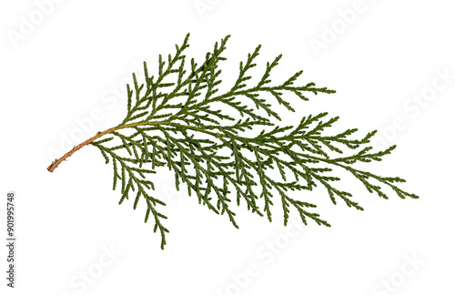 Wall mural a dried pressed thuja branch isolated on a white background. design element for creating christmas c