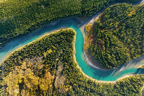 Wall mural a drone view of the river in the woods. an aerial view of an autumn forest. winding river among the