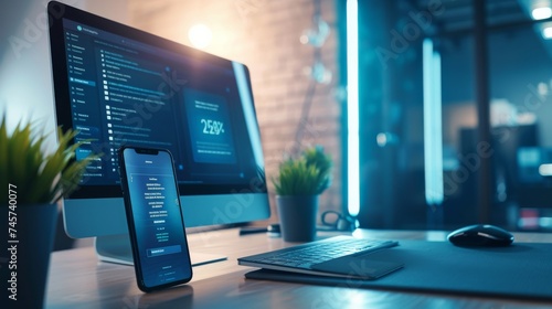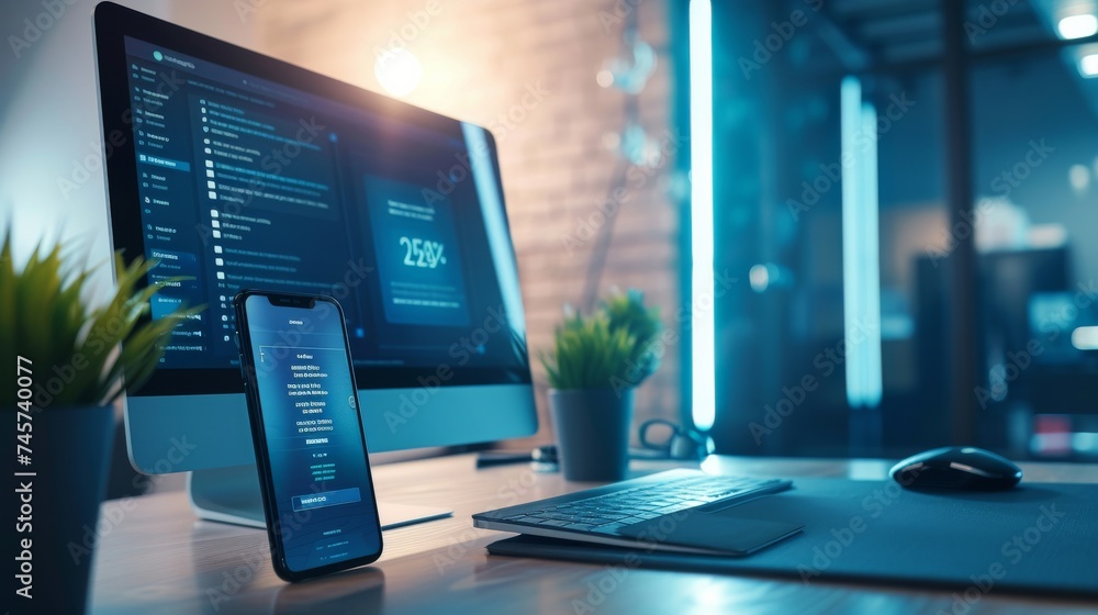 Wall mural a dynamic, close up shot of a computer screen and a smartphone side by side on a clean, modern desk.
