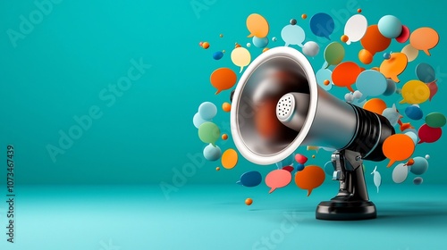 Wall mural a dynamic 3d megaphone surrounded by an explosion of vibrant colorful speech bubbles against a solid