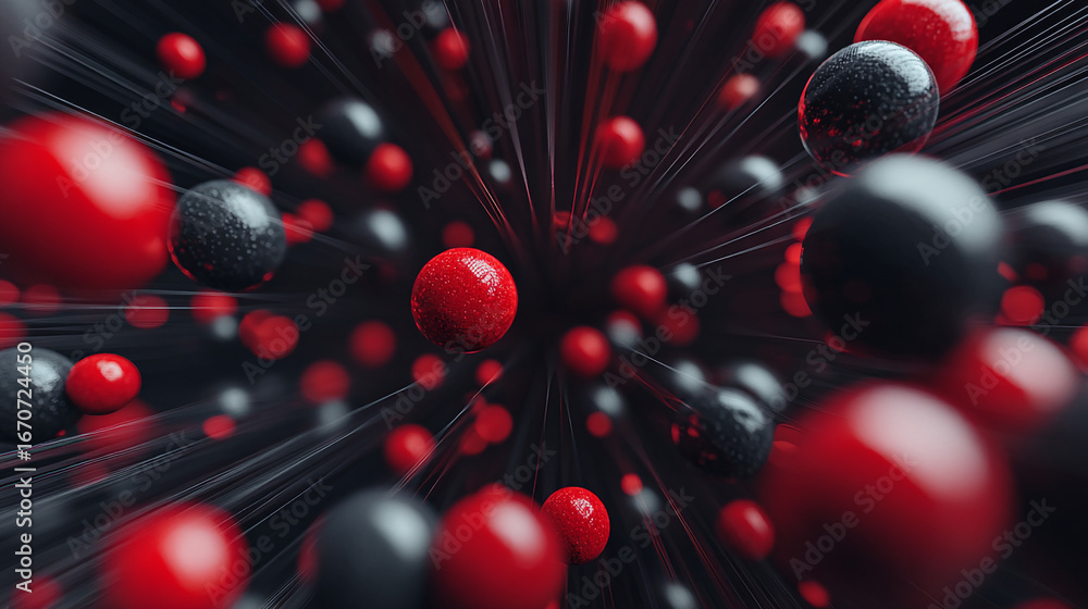 The watermark will not be included on Wall mural.: A dynamic array of red and black spheres with motion blur effect on a dark abstract background scene