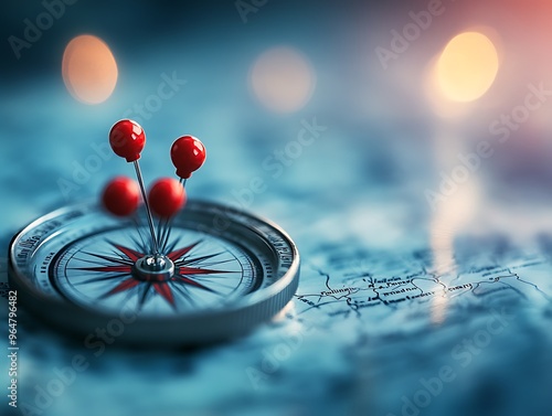 Wall mural : A dynamic compass with red pins punctuating a partially visible map -