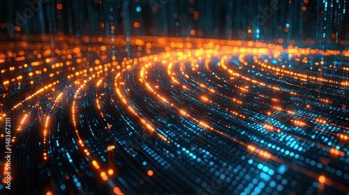 Wall mural a dynamic display of curving lines composed of orange and blue dots against a dark background