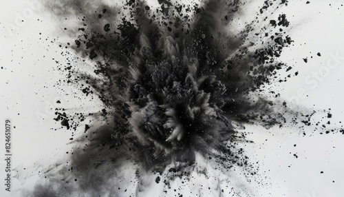 Wall mural a dynamic explosion of black charcoal powder against a white background, creating an abstract patter