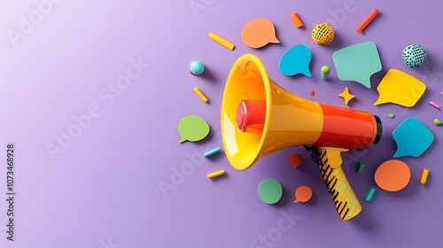 Wall mural a dynamic megaphone with vibrant speech bubbles swirling around it on a rich purple background repre